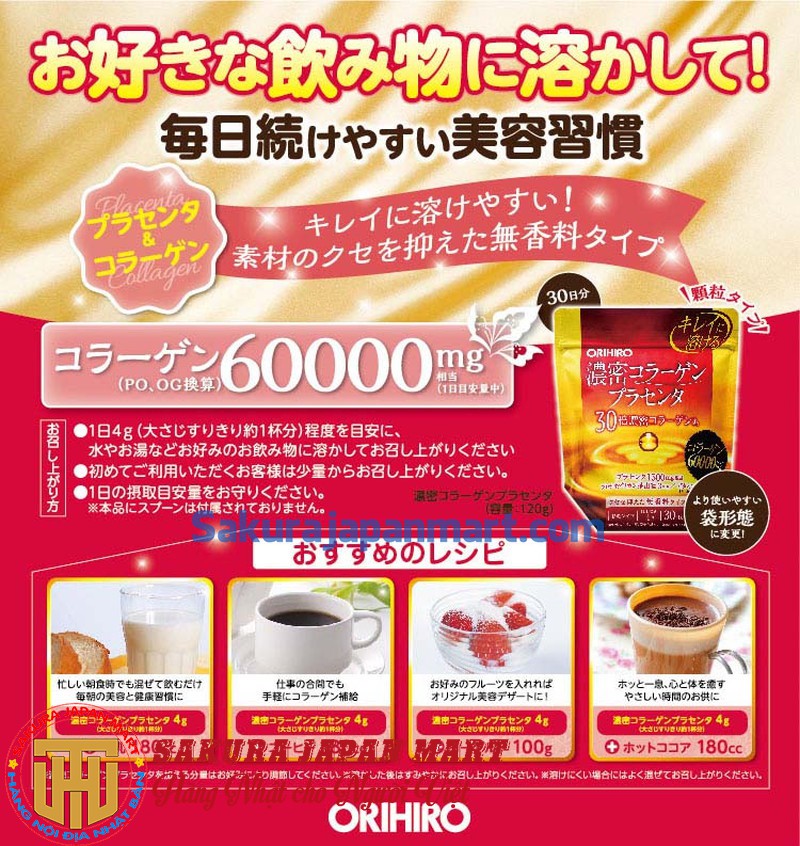 Bột Orihiro giúp bổ sung hàm lượng lớn Collagen Peptide 60,000mg, từ đó giúp cải thiện các nếp nhăn, vết thâm, nám, sẹo… để nuôi dưỡng da được mịn màng, trắng sáng và đàn hồi.
