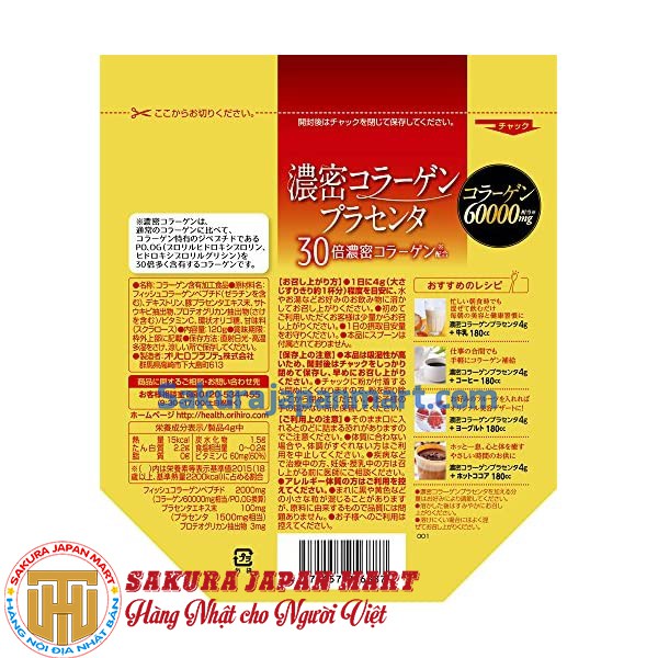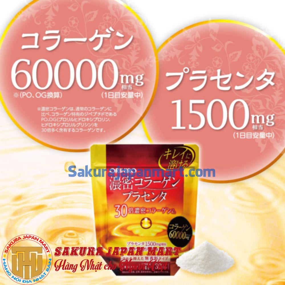 Hàm lượng thành phần có trong 4g bột: Collagen 2000mg, bột chiết xuất nhau thai 100mg, chiết xuất Proteoglycan 3mg, Vitamin C 60mg.