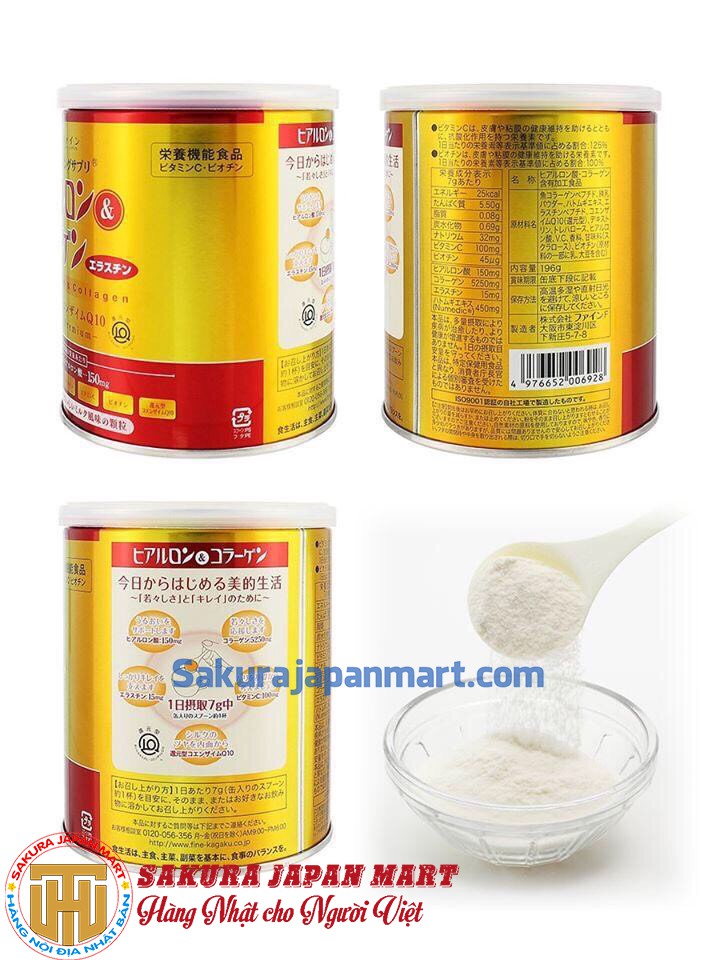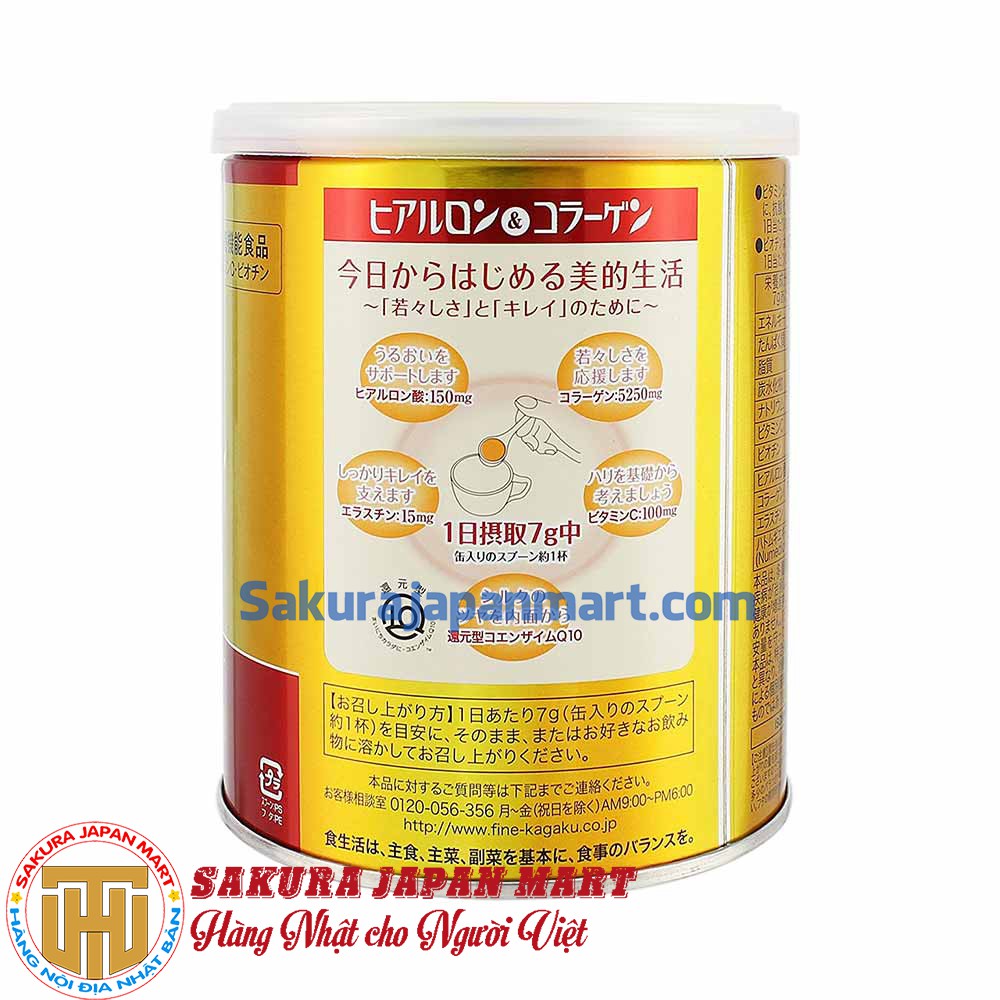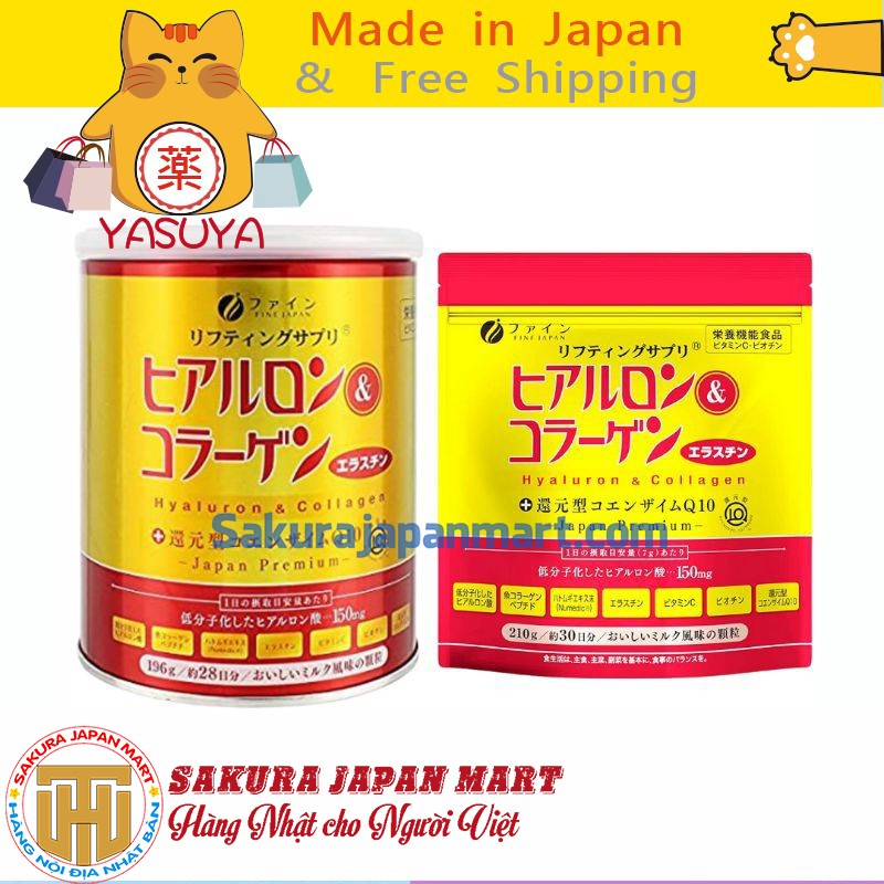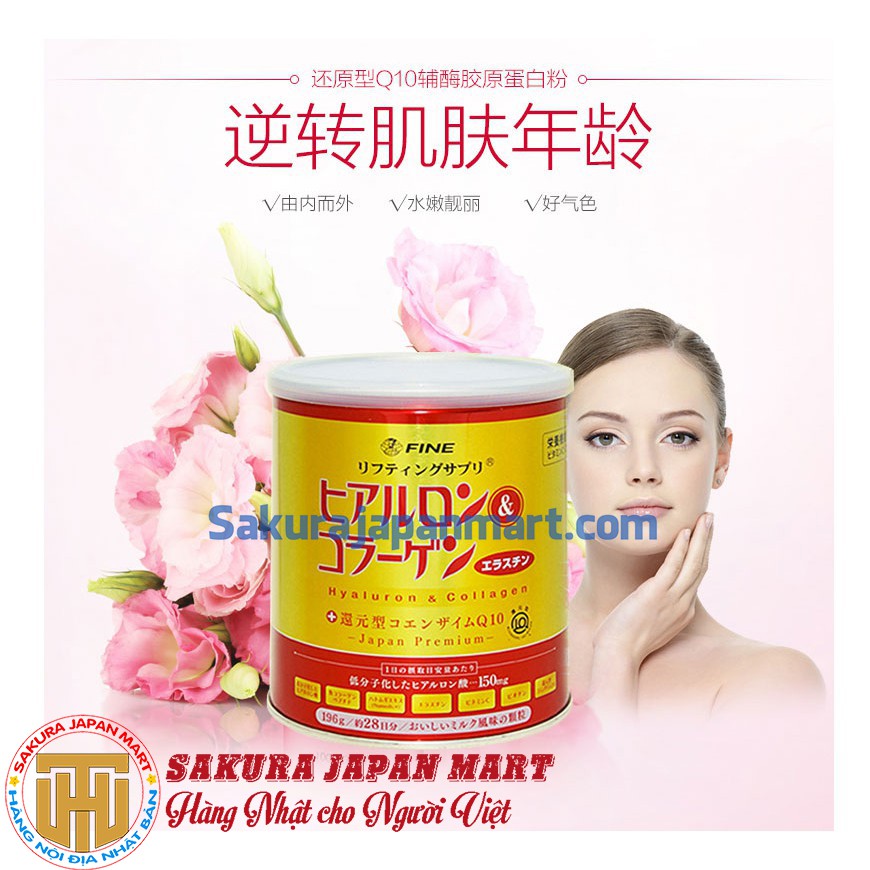 - Bột uống Collagen & Hyaluron Fine Japan 196g có thành phần chính là collagen tự nhiên hàm lượng cao, chiết xuất từ cá. Kết hợp với các dưỡng chất làm đẹp cao cấp như: Hyaluronic; Vitamin C; Co.Q10; Elastin… Mang đến tác dụng tích cực và rõ rệt trong việc cải thiện và tăng độ đàn hồi cho da, chống lão hóa, làm đầy rãnh nhăn,… Mang đến cho bạn làn da trắng sáng, săn chắc, căng mịn đầy sức sống.