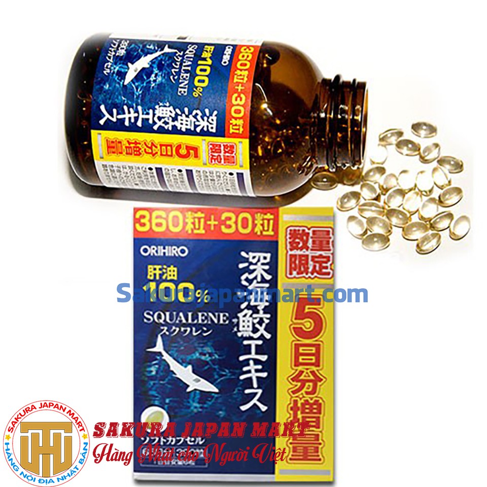 Viên uống sụn vi cá mập Orihiro Squalene 390 viên chiết xuất từ sụn cá mập đông khô chứa dầu gan cá mập 96% công dụng hỗ trợ điều trị bệnh xương khớp, tốt cho tim mạch và mắt, sản phẩm chứa nhiều acid béo Omega-3 EPA giúp cải thiện làn da, sáng mắt…