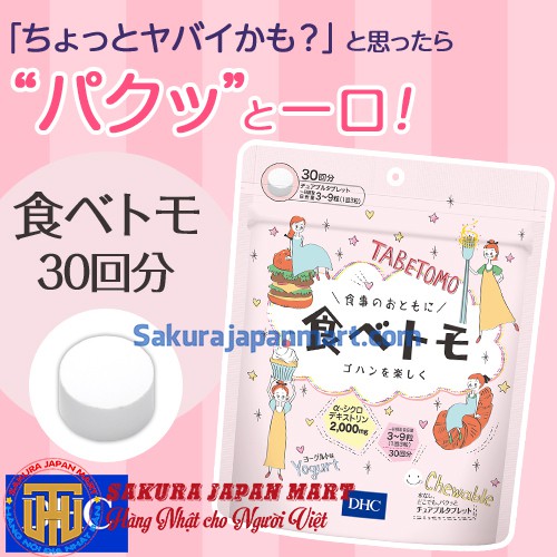 Viên nhai giảm cân TabeTomo DHC chứa nhiều thành phần Vitamin B1, B6, B12 và các loại acid amin giúp thức ăn tiêu hóa tốt hơn và hạn chế hấp thụ chất béo, cho cơ thể thon gọn.
