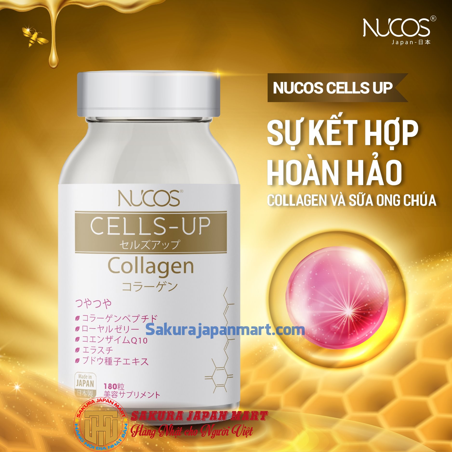 Viên uống Nucos Cells-up Collagen chứa các thành phần “vàng” dưỡng da như Collagen Peptide, Coenzyme Q10, Elastin… giúp cải thiện các tình trạng lão hóa da như chảy xệ, nhăn, thâm nám…