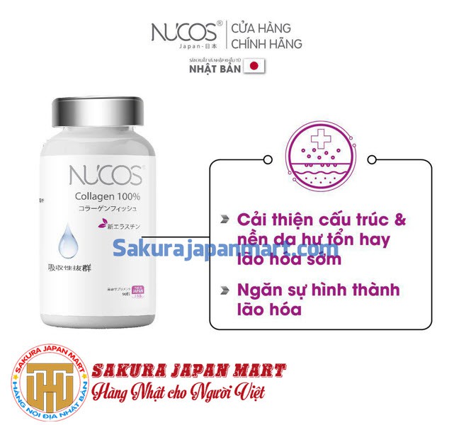 Viên uống Nucos Collagen 100% giúp bổ sung Collagen và Elastin, giúp cải thiện các tình trạng da lão hóa như khô ráp, sần sùi, có nếp nhăn… từ đó mang lại làn da tươi trẻ, săn chắc.