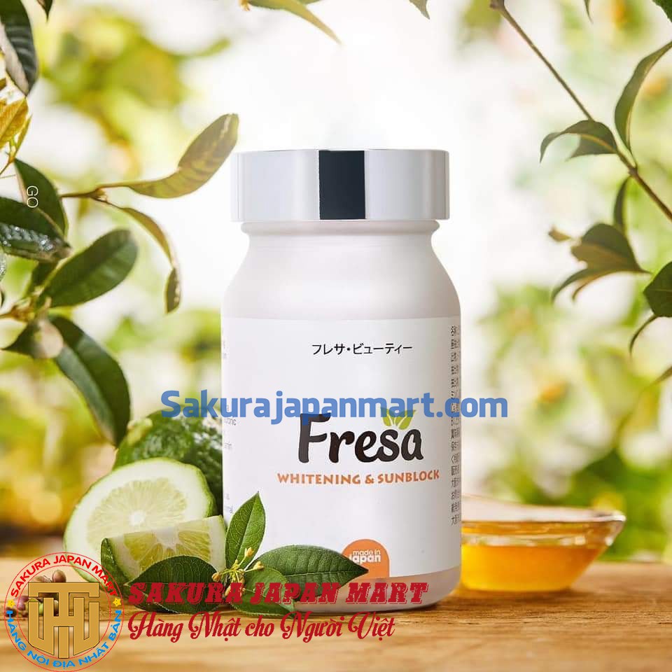 - Viên uống chống nắng, dưỡng trắng da Fresa sở hữu bảng thành phần ấn tượng với sự kết hợp của chiết xuất lựu đỏ, hạt nho, cà chua, vitamin A, B1, C, E giúp tăng cường khả năng đề kháng và kích hoạt cơ chế tự bảo vệ của làn da, hạn chế tác động của tia UV.