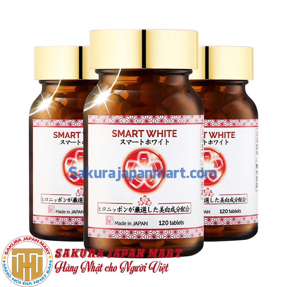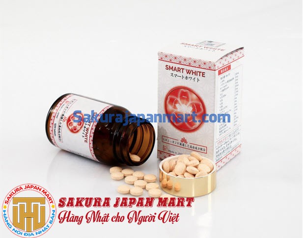 - Viên uống Smart White có các thành phần như L-Cystine, Vitamin C, chiết xuất từ dứa, sen, hạt tiêu dài… giúp máu lưu thông tốt hơn, cải thiện các nếp nhăn, thâm nám, sạm đen bằng cách gây ức chế Melanin tích tụ trên da, giúp da được phục hồi lại trạng thái ban đầu và trắng sáng rực rỡ.
